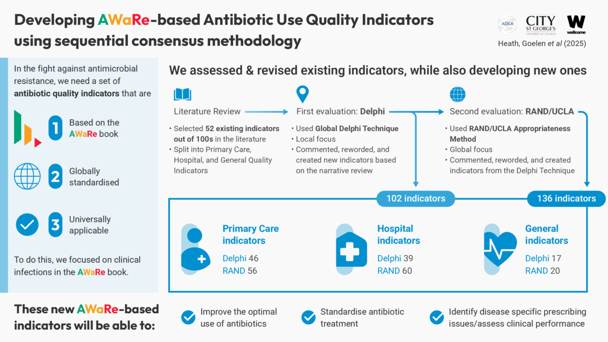 Utilising two rounds of a Delphi Technique and the RAND/UCLA Appropriateness Method, over 100 global experts in antibiotic use and policy participated in multiple rounds of surveys and panels to evaluate potential AWaRe indicators. Through this process, the project synthesised and rated numerous indicators on their clarity, appropriateness, and feasibility. Ultimately, the project successfully developed globally and locally applicable, disease specific AWaRe QIs to optimise antibiotic use across primary care and hospital settings. The indicators have been aligned with the Global PPS to allow facilities to analyse their PPS data using the QIs with an automated dashboard system.