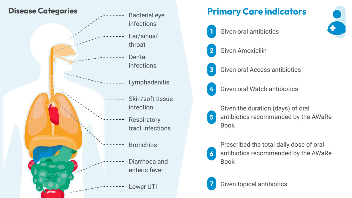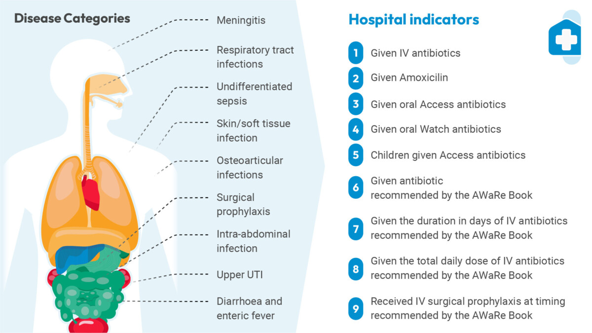 AWaRe quality indicators provide allow for disease specific, granular understanding of antibiotic use data at primary/outpatient and hospital levels.